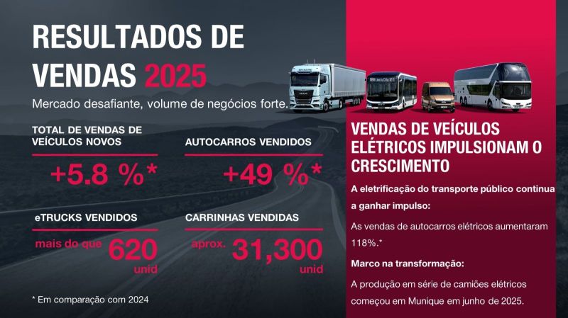 A MAN Truck & Bus entregou um total de cerca de 101.600 veículos novos no ano fiscal de 2025, aumentando as suas vendas de unidades em pouco menos de seis por cento em relação ao ano anterior. Este resultado foi alcançado apesar da manutenção de condições de mercado difíceis – em particular no mercado europeu de camiões, que se encontra a um nível semelhante ao registado durante a pandemia de coronavírus nos principais mercados. Um dos principais motores do crescimento das vendas foram os veículos elétricos a bateria (BEV), que registaram uma evolução muito dinâmica nos segmentos de camiões e autocarros.