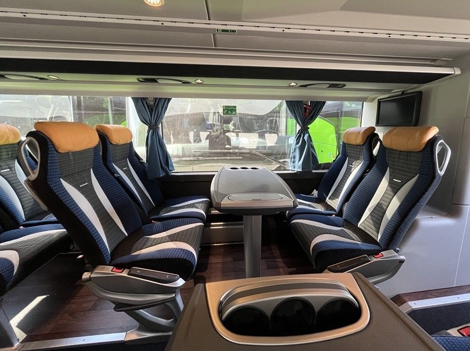 O conforto dos passageiros também não foi esquecido. As viaturas dispõem de bancos Setra Voyage Plus, lotação para 82 passageiros, tomadas USB entre assentos, e um sistema multimédia com cinco monitores Full HD de 15 polegadas. Com duas zonas de lounge, estes autocarros oferecem um espaço de viagem premium, pensado para proporcionar máximo conforto aos passageiros. Os bancos ergonómicos de alta qualidade, dispostos frente a frente com mesa central, criam um ambiente ideal para trabalhar, socializar ou simplesmente relaxar durante o percurso. Esta área acrescenta um verdadeiro valor à experiência de viagem, permitindo maior liberdade de movimento, interação entre grupos e uma sensação de exclusividade que distingue o serviço da Scotturb. A combinação de materiais de topo, iluminação cuidada e uma disposição ampla transforma cada deslocação num momento mais confortável, funcional e agradável para todos os passageiros.